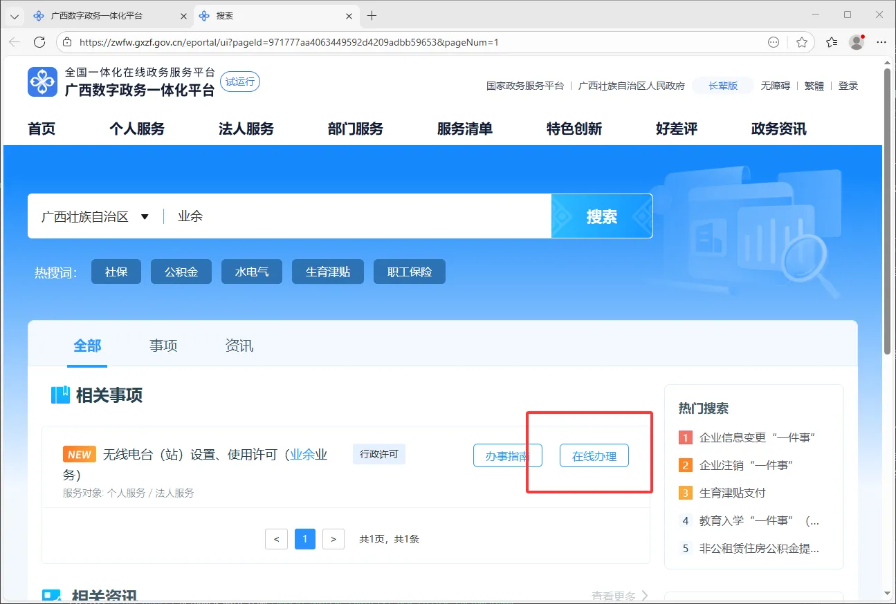 登录完成后,直接在主页中间的搜索框输入 【业余】 两个字,然后搜索、在线办理。